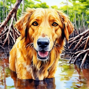 Охотничий пёс с желтым окрасом, по кличке Проныра, который обнаружил для меня гнездо, тихо заскулил с места на платформе, что располагалась на сваях из корней мангровых деревьев и мусора. Закат позади него, придавал ему розовую флуоресцентную ауру.