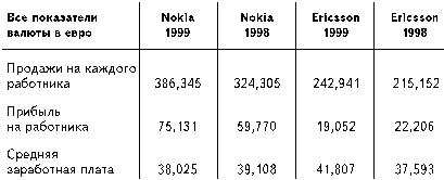 Теперь обратимся к вопросу расходов компании на персонал. Похоже, единственными людьми, которых разочаровывает Nokia, являются ее собственные служащие. Значительное число работающих в Nokia людей считают, что компания на них экономит, и данные по средней заработной плате на каждого работника относительно Ericsson это подтверждают. Это, кажется, единственный показатель, по которому Nokia уступает Ericsson. Заметим, что эти показатели представлены в евро.