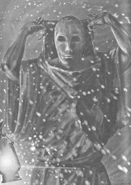 В толще кружащейся вьюги появилось сияние, постепенно расширявшееся, пока в его ореоле не начали различаться очертания фигуры: человек в длинной черной рясе с капюшоном. Он шел медленно, как будто каждый шаг стоил ему нечеловеческих усилий. В правой руке он держал посох, к концу которого крепился фонарь.