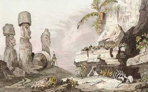 Кстати, англичане видели, как пасхальцы исчезали под землей, пользуясь тесными ходами среди каменных груд, и Форстер (1777, с. 570–571) предположил, что ходы эти ведут в естественные пустоты: «Мы были бы рады это проверить, но островитяне ни за что не хотели пускать нас в такие места». Он (там же, с. 595–596), как и Кук (1777, с. 289), обратил внимание на резкую диспропорцию в количестве мужчин и женщин и заподозрил, что женщин и детей прячут в подземных тайниках. Форстер заключает: «Правда, наш отряд не видел никаких лощин или глухих ущелий, где могли бы укрыться женщины на время нашего пребывания, но я должен напомнить читателю об упомянутых выше пещерах, куда островитяне упорно не пускали пас. Пещеры Исландии достаточно просторны, чтобы вместить несколько тысяч обитателей, и ничто не мешает нам допустить, что в сходном вулканическом краю подобные пещеры могут служить убежищем для нескольких сот человек».