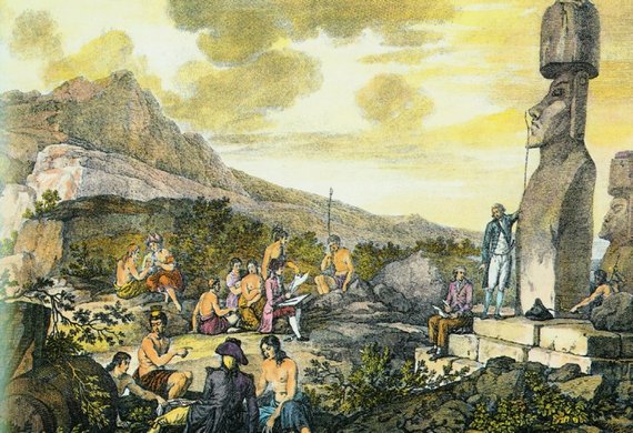 Русским путешественникам был оказан смешанный прием – одни пасхальцы выказывали свое дружелюбие, другие осыпали гостей градом камней, и высадиться на берег удалось лишь после того, как выстрелом убили одного пасхальца. Гости видели очень мало женщин – очевидно, те опять укрылись в тайниках. Наскоро обменявшись товарами с местными жителями, русские тут же возвратились на корабль и записали, что на острове не видно европейских растений и животных, привезенных Лаперузом (Коцебу, 1812–1823, ч. 1, с. 46–53).