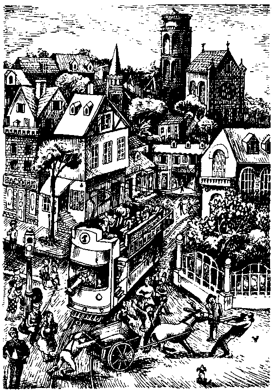 Автомобилей в городе не было, но зато там был трамвай, один-единственный. Он был двухэтажный, старый и уютный. Ходил он от городских ворот через главную площадь до моста возле парка. Маршрут был не очень-то длинный: всего-навсего две остановки. Но жители города любили свой трамвай и каждый день на нем катались: кто ехал по делу, а кто просто так, для удовольствия.