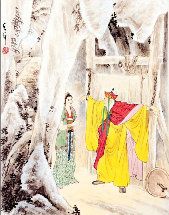 Перепуганный бесенок кувырком покатился вниз, в ущелье. Оба монаха пустились за ним вдогонку, но его и след простыл. Монахи побежали вперед еще немного и увидели пещерный дворец. Обе створки массивных мраморных ворот были плотно закрыты. Над воротами была вделана каменная плита, на которой были высечены в каллиграфическом стиле большие иероглифы. Вот что они обозначали: «Пещера Девяти кольцевых извивов на горе Коленце бамбука».