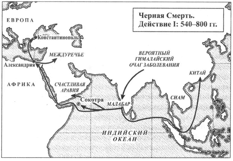 В начале нашей эры зараженные блохи или грызуны как-то смогли проделать путь от какого-то из древних резервуаров заболевания, вероятно от индийских подножий Гималаев, до Малабарского побережья, где зараженные черные крысы вскарабкались по канатам на торговые корабли, следовавшие на запад. Зимний муссон перенес корабли через Индийский океан в Александрию (а может быть, в промежуточные порты, такие как Аден или остров Сокотра). Это случилось достаточно быстро, чтобы крысы могли дожить и, высадившись на берег, передать бациллу дальше. В 541 году, во время правления византийского императора Юстиниана, появились первые свидетельства распространения чумы – Черной смерти (называемой так из-за появления характерных черных бубонов). Историк Прокопий Кесарийский пишет, что «Юстинианова чума» впервые (по крайней мере, на взгляд европейцев) появилась в Египте. Как и следовало ожидать, ее занесли в восточный Египет через Красное море. (Более удобный «путь Синдбада» через Персидский залив был перекрыт Персидской империей, главной соперницей Византии.) {225}