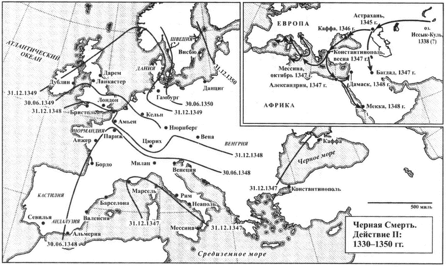 В 1347-1350 годах зараза медленно и неуклонно ползла из Италии на север. Как показано на карте, она продвигалась морем и сушей, обычными путями доставки товаров, но морем быстрее, чем сушей. Некоторые маленькие поселения вымерли полностью, хотя многие более крупные города беда почти не затронула. По самым основательным подсчетам, за эти годы погиб каждый четвертый или даже каждый третий европеец. Хотя первая вспышка закончилась к 1350 году, новые возникали на протяжении десятилетий. Промежутки между ними становились все больше, как это было и после «Юстиниановой чумы». Во время эпидемии 1575-1577, а затем 1630-1631 годов Венеция потеряла третью часть жителей. {242}