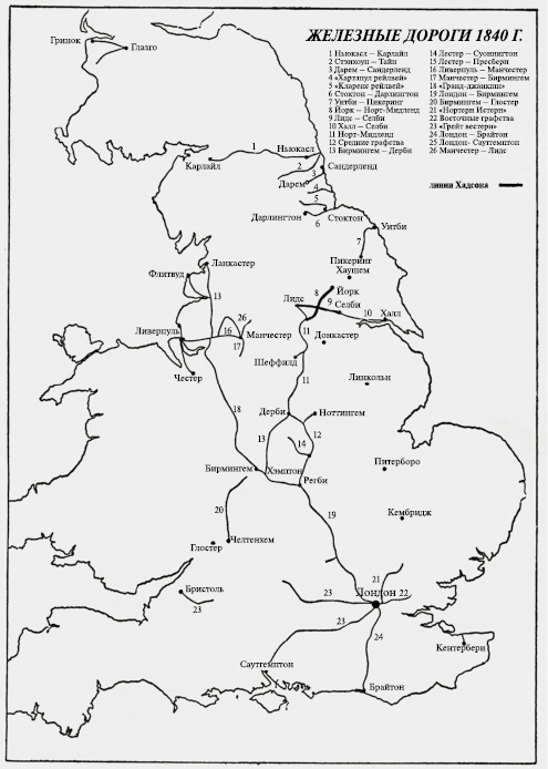 Британская железнодорожная сеть в 1830 году (линии Хадсона выделены жирным). Источник: The Railway King, by Richard S. Lambert, London, George Allen & Unwin Ltd, © 1964, p. 57. Copyright ©1934 HarperCollins Publishers.