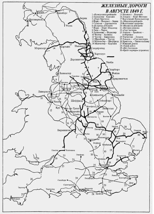 Британская железнодорожная сеть в 1849 году (линии Хадсона выделены жирным). Источник: The Railway King, by Richard S. Lambert, London, George Allen & Unwin Ltd, c 1964, p. 238. Copyright c1934 HarperCollins Publishers.