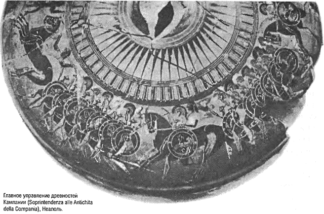 Первая из этих греческих ваз датируется концом VII в. до н. э., когда фаланга была еще нововведением, а вторая, менее поврежденная, была расписана, по-видимому, двумя поколениями позднее. На верхнем фото показаны две шеренги фаланги, атакующие на полном ходу, но строго держащие шаг, а конница охраняет каждый фланг боевого порядка. В реальном бою задние шеренги фаланги сближались с передними, образуя единую, слаженно действующую человеческую массу. Художнику же, расписывавшему вазу, пришлось, руководствуясь чисто художественными соображениями, разделить шеренги и показать только две из них. Детали тяжелого вооружения пехотинцев (гоплитов) – шлемы, щиты, копья и наколенники – более отчетливо видны на фото внизу.