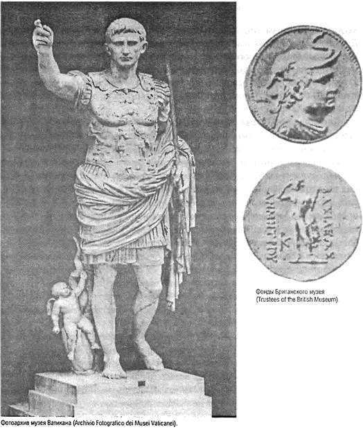 Деметрий, царь Бактрии (ок. 190—160 гг. до н. э.), изображен на монете (справа вверху) в головном уборе в виде слона, символизирующем его победы в Индии. Надпись на реверсе монеты: «Царь Деметрий». Расцвет Греко-Бактрийского царства, оседлавшего Гиндукуш, представляет собой высшую точку эллинистического политического господства в Центральной Азии. Через полтора столетия далеко на Западе консолидация Римской империи, достигнутая Августом (27 г. до н. э. – 14 г. н. э.), по сути, положила конец военной экспансии Рима. Как портрет Деметрия в вычурности головного убора отражает окружающую обстановку Индии, так и военная форма Августа отражает римское окружение. Однако достаточно очевидна общая сердцевина эллинистического стиля – как это ясно показывает сходство между позой Августа и фигурой Зевса на реверсе монеты Деметрия.