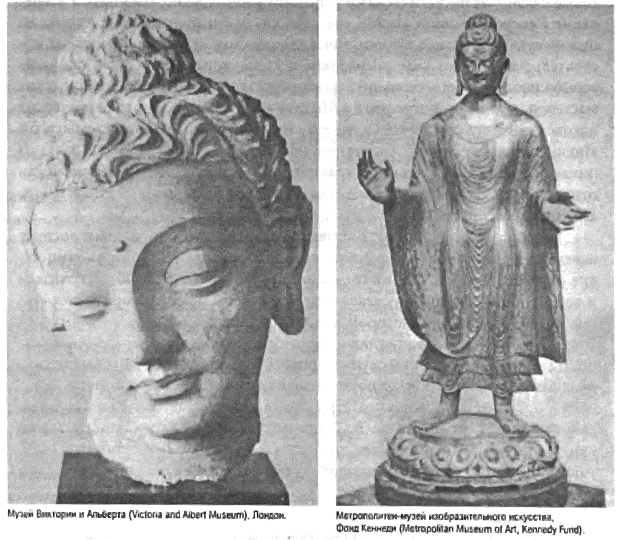 Голова Будды (фото слева) представляет удивительно удачный образец скульптуры Гандхары, где, похоже, эффективно сливаются эллинистический и индийский стили. Дата этого портрета неизвестна, но некоторые исследователи относят ее к V в. н. э. Стоящий Будда (фото справа) датирован по надписи на нем 477 г. н. э. и представляет собой один из наиболее ранних сохранившихся примеров буддийской скульптуры из Китая. Греко-индийское влияние явно прослеживается в таких деталях, как прическа и выражение лица; но китайский либо среднеазиатский художник, изваявший эту статую, превратил то, что ранее было реалистическим изображением складок одежды в декоративный орнамент. Как гандхарский, так и китайский скульпторы стремились изобразить благосклонное божество, и тут натуралистическое, в конечном счете эллинистическое культурное наследие не имело почти никакого значения. Отсюда стилистическая трансформация и близкие параллели как по времени, так и по духу в похожем переходе от греко-римского к византийскому стилю на эгейской родине самого эллинизма.