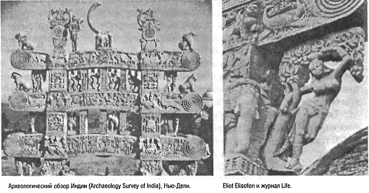 Общий вид Большой ступы в Санчи в Индии показывает ее планировку с четырьмя витиевато украшенными входами под центральный купол, где помещены мощи Будды, придающие этому месту особую святость. Слева внизу фотография скульптурного украшения северных ворот дает представление о богатстве и сложности композиции, отчасти чисто декоративной, отчасти составленной из сцен жизни Будды. Деталь (справа внизу) литых ворот намекает на чувственность индийской жизни и религиозности, всегда противостоявшую аскетической традиции, столь заметной в литературе.