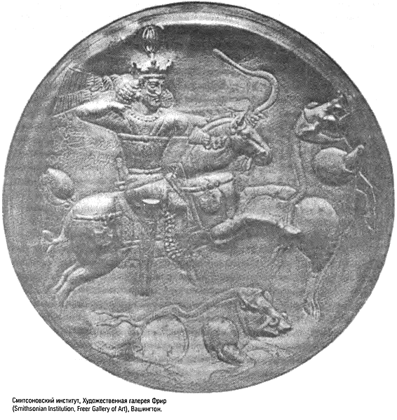 На серебряном кубке изображена сцена из жизни сасанидских монархов, занимающихся тем, что им более всего приличествует, – охотой и войной. Кубок сохранился достаточно хорошо для демонстрации того, что, подобно своим ассирийским предшественникам, сасанидские рыцари не пользовались стременами и, в отличие от своих двойников на Дальнем Западе, не считали ниже своего достоинства пользоваться луком и стрелой.