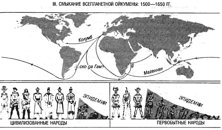 А. ВЕЛИКИЕ ЕВРОПЕЙСКИЕ ГЕОГРАФИЧЕСКИЕ ОТКРЫТИЯ И ИХ МИРОВЫЕ ПОСЛЕДСТВИЯК началу XVI в. европейцы с Атлантического побережья владели тремя секретами успеха, которые позволили им покорить все океаны мира за какие-то полвека и подчинить себе наиболее развитые районы Америки за жизнь одного поколения. Этими талисманами были глубоко укоренившаяся задиристость и безрассудство (1), реализуемые с помощью сложной военной технологии, особенно в морском деле (2), а также население, привычное к тем видам болезней, которых не знал Новый Свет (3).