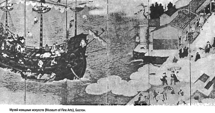 На этой красивой, ярко расписанной ширме японский художник конца XVII в. отразил свои впечатления от прибытия португальского корабля. Корабль только что прибыл, матросы еще спускаются по снастям, а некоторые готовятся к высадке. На переднем плане встречающих японских сановников окутали плотные клубы дыма, произведенные, без сомнения, орудийным салютом. Длинный волнообразный язык дыма, вползающий на берег с европейской плавучей орудийной платформы, символизирует начальный этап европейского влияния на весь остальной мир в эпоху великих морских открытий.