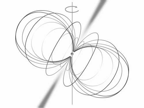 Раскрыть тайну пульсара можно, если немного схитрить и позволить полюсам интенсивного магнитного поля нейтронной звезды немного отклониться от оси ее вращения. Здесь, на Земле, пусть и в меньшей степени, наблюдается столь же асимметричное взаимное расположение соответствующих осей. В таком случае магнитные полюса описывают вокруг осей вращения круги (рис. 13.1). Открытые силовые линии магнитного поля на полюсах обеспечивают выброс электромагнитного излучения, которое проходит сквозь области Галактики подобно лучу маяка, и если Земля случайно оказывается на пути этого луча, то наши радиотелескопы улавливают регулярные пульсации излучения. В итоге астрономы объясняют пульсары как нейтронные звезды, у которых магнитные оси время от времени проходят через наш луч зрения. Поскольку эта модель работает как никакая другая, она получила широкое признание.