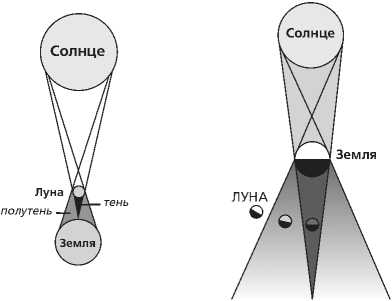 Рис. 2.9.Слева: геометрическая схема полного солнечного затмения. С участков Земли, попадающих в область тени, видно полное затмение, с тех, что находятся в полутени, – частное. Справа: геометрическая схема полного лунного затмения. Здесь область тени, отбрасываемой Землей, шире Луны. (На основе материалов Paul Derrick’s Stargazer, www.stargazerpaul.com/s_eclips.htm.)