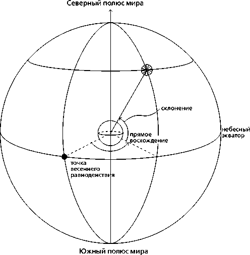 Располагать астрономические объекты в системе координат, связанной с Землей, довольно проблемно, поскольку со временем эти координаты, пусть и медленно, но все-таки меняются. Об этом впервые упомянул около 140 года до нашей эры древнегреческий астроном Гиппарх. Сравнив свои наблюдения с астрономическими записями, сделанными за предшествующие 150 с лишним лет, он обнаружил, что долготы некоторых ярких звезд, расположенных вдоль зодиака, изменились на эквивалент 2°. Это равняется угловому смещению примерно на 50″ в год, и по прошествии долгого времени положение может перемениться очень заметно. Например, даже точка весеннего равноденствия за последние 2000 лет сместилась вдоль небесного экватора на 28°. Пять тысяч лет назад, во времена, когда в истории Древнего Египта шел династический период, Солнце пересекало небесный экватор в созвездии Тельца, а сегодня это происходит в созвездии Рыб. Такое смещение влечет всевозможные последствия для астрологии. Скажем, если ваш астрологический «солнечный знак» – Стрелец, это не значит, что Солнце в день вашего рождения непременно находилось в созвездии Стрельца. И более того, все астрологические солнечные знаки смещены примерно на одно зодиакальное созвездие по сравнению с тем расположением Солнца в зодиакальном круге, которое мы наблюдаем сейчас в том или ином месяце.