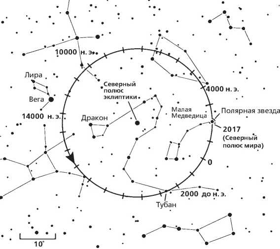 Рис. 2.4. Спроецированная на небесную сферу окружность, которую «чертит» земная ось. Сейчас северный полюс оси указывает на Полярную звезду в созвездии Малой Медведицы. Но 5000 лет назад он был направлен на Тубан, α Дракона, а через 13 000 лет нацелится на Вегу, α Лиры. (На основе материалов Roen Kelly, Astronomy Magazine.)