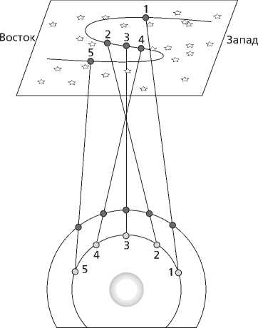 Рис. 2.7. Орбиты, по которым Земля и Марс обращаются вокруг Солнца. Земля на внутренней орбите движется быстрее и «обгоняет» Марс, и возникает впечатление, что Марс меняет курс на противоположный и движется попятно (см. линии 2–4). Только по прошествии нескольких месяцев наблюдатель увидит, что Марс возобновил свое прямое движение на восток через зодиакальные созвездия (см. линию 5). (Материалы любезно предоставлены Brian Brondel, Wikimedia Commons.)