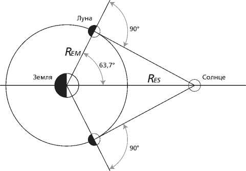 Рис. 3.2. В основе геометрического соотношения, при помощи которого Аристарх определил расстояние от нашей планеты до Солнца, лежат расстояние между Землей и Луной и положение Луны в фазах первой и последней четверти. Здесь REM – линия, призванная обозначить расстояние от Земли до Луны, а RES – расстояние от Земли до Солнца. Линии не соответствуют реальному масштабу, – самое главное, что расстояние до Солнца намеренно, но неточно уменьшено, чтобы нагляднее представить углы, имеющие прямое отношение к расчетам. На самом деле Солнце в 400 раз дальше от Земли, чем Луна, и рассматриваемый угол равен 89,83°. Угол, показанный на рисунке, гораздо меньше. (По источнику: L. E. Murray.)