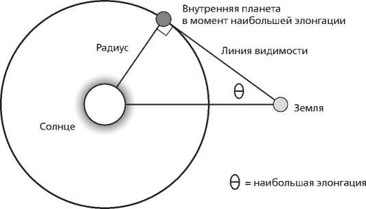 Рис. 3.4. Благодаря системе Коперника удалось вычислить относительные расстояния от планет до Солнца, после чего наибольшее удаление внутренней планеты от Солнца (элонгация) и благоприятные периоды видимости внешних планет позволили установить ключевые геометрические соотношения. (По источнику: David McClung, themcclungs.net/astronomy/concepts/ plotinner.html.)