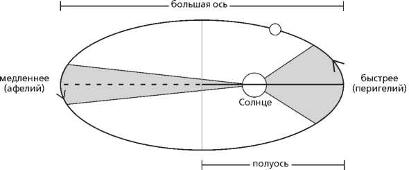 Рис. 3.5. В первых двух законах движения планет Кеплер предположил, что каждая планета движется по эллипсу, причем Солнце находится в одном из его фокусов. Планета меняет скорость, и радиус-вектор, связывающий ее с Солнцем, заметает равные площади за равное время (как показано на затемненных областях, имеющих одинаковую площадь). Обратите внимание, что на рисунке сильно преувеличено удлинение (или эксцентриситет) орбиты. Реальные орбиты планет в Солнечной системе почти круговые.