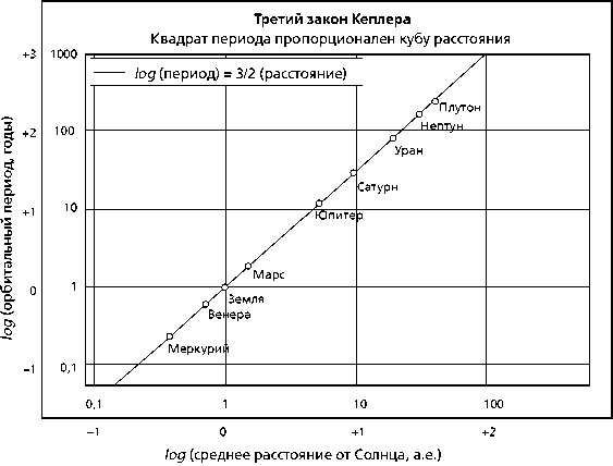 Рис. 3.6. Согласно третьему закону Кеплера, орбитальные периоды планет не равны, а возрастают в степени, равной 3/2 среднего расстояния от планеты до Солнца (в астрономических единицах [а. е.]). При построении графика в логарифмическом масштабе (со степенями десяти через равные промежутки времени) это соотношение выглядит как прямая линия с наклоном 3/2.