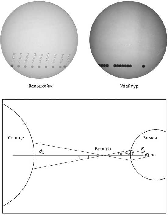Рис. 3.7.Вверху: телескопические наблюдения за Венерой во время ее астрономического транзита по диску Солнца 8 июня 2004 года. Траектория планеты предстает по-разному в зависимости от земной широты, на которой находится наблюдатель. Данные, полученные из немецкого Вельцхайма (слева) и индийского Удайпура (справа), показывают незначительные различия в траекториях. (Материалы любезно предоставлены GONG/NSO/NSF.) Внизу: геометрические соотношения между Солнцем, Венерой и Землей объясняют, что траектории, по которым Венера проходит мимо солнечного диска, меняются сообразно тому, насколько далеко от Солнца находятся планеты и насколько велика дистанция между наблюдателями на Земле. На основе этих соотношений можно рассчитать соответствующие расстояния между Землей, Венерой и Солнцем.