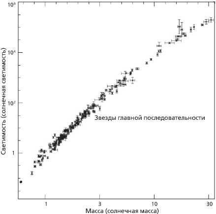 Если учесть все требования и сложности, связанные с определением звездных масс, вы, возможно, не удивитесь, узнав, что сколь-либо точно нам удалось «оценить» лишь пару сотен звезд. Эти драгоценные светила позволили выявить критически важную взаимосвязь между светимостью звезды главной последовательности и ее массой (рис. 6.3). По мере увеличения массы звезды наблюдаемая светимость стремительно возрастает. Более того, соотношение массы и светимости для звезд главной последовательности можно выразить формулой, имеющей вид степенного закона: L / LSun = (m / mSun)n, где показатель степени (n) составляет около 4 как для звезд солнечной массы, так и для более массивных. При столь высоком показателе степени простое удвоение массы звезды приведет к шестнадцатикратному увеличению ее светимости. Рассмотрим звезду главной последовательности класса О массой 30 M⊙. Ее светимость превысит солнечную более чем в 100 000 раз. Почему это соотношение массы и светимости столь велико и каковы последствия?