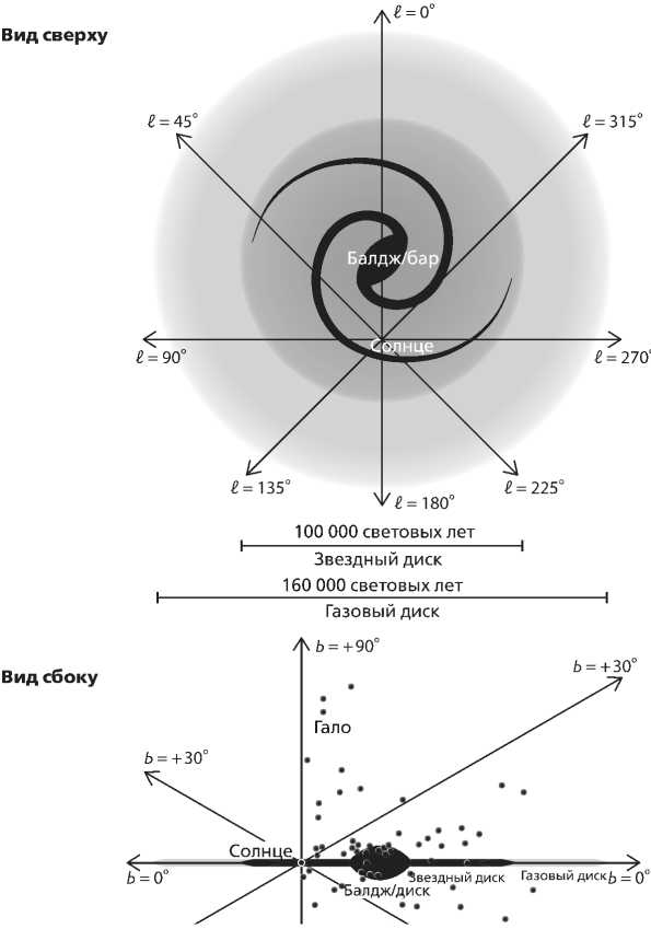 Рис. 7.1. Схематичные изображения Млечного Пути в том виде, в каком он предстает перед наблюдателями, находящимися далеко за его пределами. Эти виды основаны на сочетании наблюдений и последующих объяснительных моделей. Вверху: Млечный Путь, вид сверху. Заметны центральный балдж и звездный бар (перемычка), окруженные диском из звезд и газа, а также спиральные рукава в диске – недавние свидетельства звездообразующей активности. Также представлено расположение галактических долгот с началом отсчета в Солнце. Внизу: Млечный Путь, вид сбоку. Заметны центральный балдж / звездный бар, тонкий диск из звезд и газа, а также гало, содержащее шаровые звездные скопления (показаны) и значительное количество темной материи (не показана). Также представлено расположение галактических широт с началом отсчета в Солнце. (Источник: The Milky Way, W. H. Waller.)