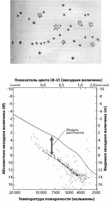 Рис. 7.3.Вверху: звездная карта скопления Плеяд (М45), составленная Галилеем и основанная на его новаторских телескопических наблюдениях. Внизу: современное сравнение показателей звездных цветов (B – V) и видимых звездных величин (m) в скоплении Плеяд, представленных извилистой линией, по сравнению с калиброванными цветами и абсолютными звездными величинами (M), установленными для звезд главной последовательности. Разница между видимой и абсолютной звездными величинами (m – M) известна как модуль расстояния, по которому можно рассчитать отдаленность скопления. В данном случае этот модуль равен 5,6 звездной величины, а значит, скопление отдалено на 132 парсека (475 световых лет). (Вверху: По источнику Siderius Nuncius [ «Звездный вестник»], G. Galilei, Venice, Italy, 1610. Изображение любезно предоставлено: History of Science Collections, University of Oklahoma Libraries. Внизу: на основе интерактивной программы, применимой для звездных скоплений, автор: K. Lee. Источник: Университет Небраски в Линкольне.)