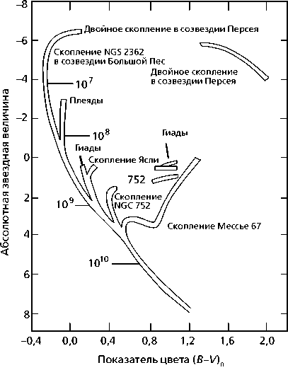 Рис. 7.4. Составная диаграмма «цвет – звездная величина» для заметных звездных скоплений в диске Галактики. Для двойного звездного скопления в созвездии Персея характерна «густонаселенная» главная последовательность; в ней есть и горячие недолговечные звезды класса В, что указывает на молодой возраст скопления – около 107 лет. А вот в главной последовательности Плеяд уже нет столь горячих звезд с высокой светимостью, значит, скопление старше – ему 108 лет. У Гиад главная последовательность усечена еще сильнее, а возраст скопления – 109 лет. (По источнику: The Milky Way, B. J. Bok and P. F. Bok, 5th edition, Harvard University Press [1981], со ссылкой на источник: H. L. Johnson and A. R. Sandage, Astrophysical Journal, vol. 121 [1955], pp. 616–627.)