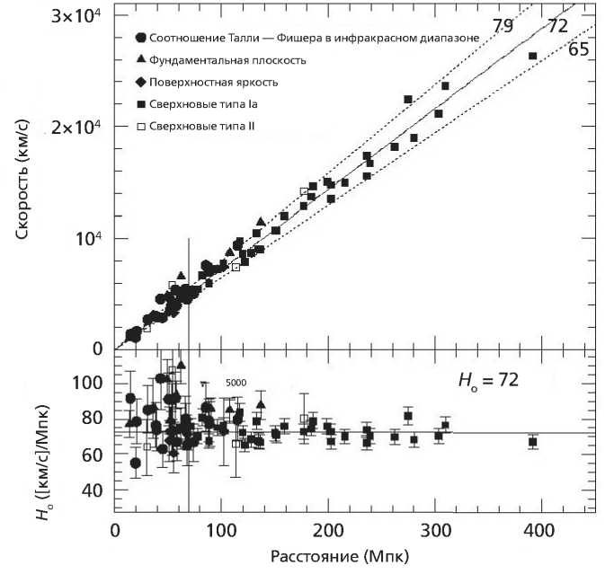 Рис. 8.5. Недавний график с демонстрацией закона Хаббла, связавшего расстояние до галактики в мегапарсеках (Мпк) и скорость ее удаления (км/с). Наклон функции дает значение постоянной Хаббла, в данном случае равное 72 (км/с)/ Мпк. (По источнику: W. L. Freedman et al., Astrophysical Journal, vol. 553 [2001], p. 47.)