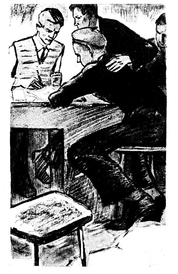 Змена скончылася, а тут работа ішла яшчэ поўным ходам. Хлопцы спяшаліся давесці Сямёнаву задуму да ладу, каб ужо з наступнага дня можна было апрацоўваць валы, сумясціўшы аперацыі. Алесь быў, канечне, з імі. Ён сядзеў за сталом, над якім схіліліся хлопцы ўсёй брыгады. Каб паглядзець, што яны робяць, Ніна аж узлезла на нейкую скрыню. Ускудлачаны Алесь нешта хутка пісаў на лісце паперы, а астатнія ўважліва сачылі за кончыкам алоўка.