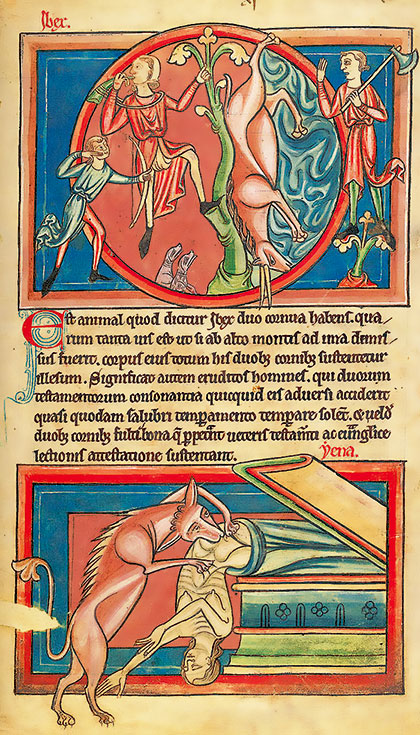 Я смотрел на агнца, носящего имя похожее на «ангел», по-видимому, как знак чистоты и благостности; хотя вообще известно, что это имя ему дано по другой причине и происходит от agnostcit – «признает», потому что это животное всегда признает свою мать и угадывает ее голос среди голосов всей отары, как и родительница его среди множества неотличимых ягнят, одинаковых по виду и по голосу, опознает всегда и именно своего собственного сына и дает ему питание. Наблюдал я и за овцою, которая зовется ovis от слова oblatione – «жертвоприношение», потому что овец с самых давних времен употребляли для ритуальных закланий; овца до того многоумна, что по собственной догадке, чуть начинается предзимье, ищет с жадностью траву и наполняет себя кормом на те дни, когда привычные пастбища будут обожжены морозом. Стада овец охраняются собаками, чье имя canis происходит от canor – «звонкий», настолько звонко они лают. Это животное совершенством превосходит всех прочих; одаренные чудесной проницательностью, псы всегда признают хозяев и выучены охотиться на зверя в лесах и в рощах, защищать стада от волчьего набега, сторожить дом и малых в доме; нередко, обороняя хозяина, пес и погибает. Царя Гараманта, уведенного в плен неприятелем, выручили и примчали на родину две сотни его собак, сумевших проложить путь через вражескую оборону; Ликий, пес Язона, после гибели хозяина перестал принимать пищу и умер от истощения; пес царя Лисимаха вспрыгнул на костер, желая сгореть вместе с прахом хозяина. Пес обладает способностью излечивать раны, зализывая их, а языки его детенышей – средство от язвы кишечника. Пес так устроен от природы, что сначала выблевывает съеденную пищу, а потом опять съедает; тем показывает поразительную воздержность, которая как символ свидетельствует о высочайшем совершенстве духа; точно так и чудотворные свойства его языка являются символом очищения от грехов, достижимого путем исповеди и покаяния. В то же время возвращение пса к однажды выблеванному символизирует, что даже и после исповеди мы возвращаемся в прежнее греховное состояние, каковой вывод оказался для меня довольно полезен в то утро и через лицезрение чудес природы предостерег мое сердце.