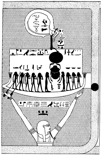 Творение. Бог Нун поднимается из первобытного океана и держит в руках ладью бога солнца Ра, которого сопровождают несколько божеств. В верхней части сцены помещено изображение области загробного мира, ограниченной телом Осириса, на голове которого стоит богиня Нут, протягивающая руки, чтобы принять солнечный диск