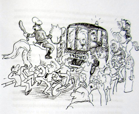 – Можно подвесить ее на резиновой ленте, так что она окажется у него на груди и не будет ему мешать, – предложил городской инженер. – А когда лев захочет писать, он оттянет ее левой рукой… то есть, извините, левой лапой, а правой будет писать.