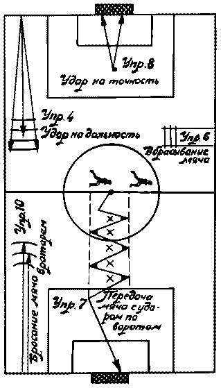 На специальных занятиях мы обычно проводим такую игру: нападающие врываются в штрафную площадь и поочередно бьют по воротам. Их, как правило, пять-семь человек, а вратарь один. И если форварды уходили с тренировки уставшими, то, представьте себе, в каком состоянии был вратарь. Но нужно было поистине крепко любить футбол, чтобы и после тренировок оставаться и отражать одиннадцатиметровые, заниматься с тренером по особому плану, наконец, отрабатывать специальные приемы. Я, например, десять-пятнадцать минут посвящал тому, что стремился в нужную точку поля выбить из ворот мяч. Много пользы от такого упражнения, когда тренер направляет мяч вначале в руки вратаря, а затем в сторону от него, все время при этом сокращая дистанцию для удара. Для начала нужно стремиться бить так, чтобы вратарь мог в броске дотянуться до мяча. Если же вы сразу набьете ему много голов, то у вратаря может пропасть охота тренироваться.