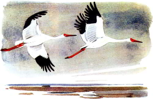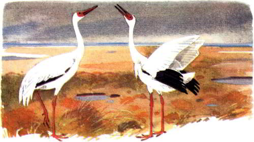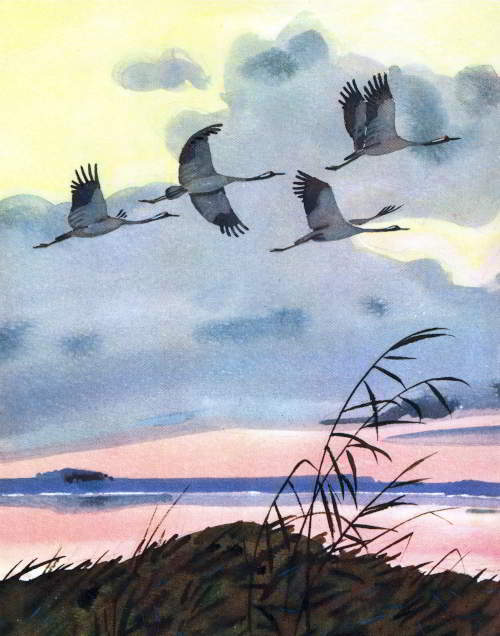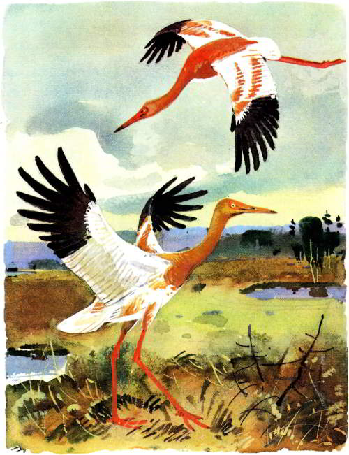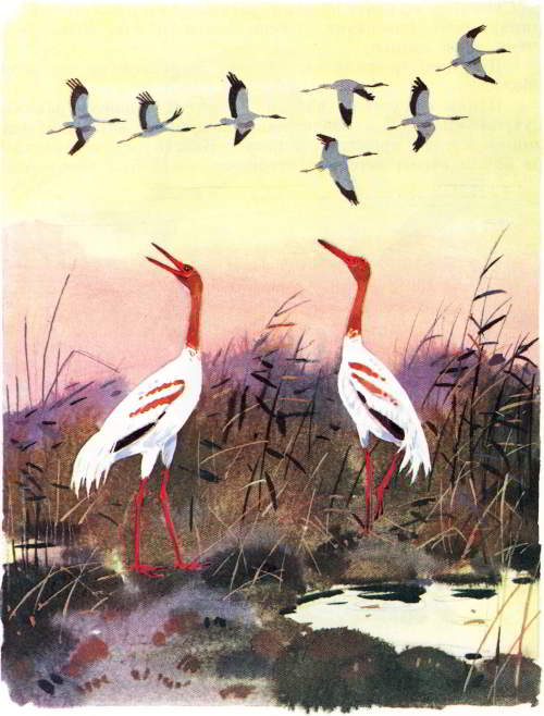 С удивлением смотрели стершата на этих птиц. Они никогда не видели других журавлей, но смутно чувствовали, что в чём-то на них похожи. И стершата пошли к отдыхающим птицам.
