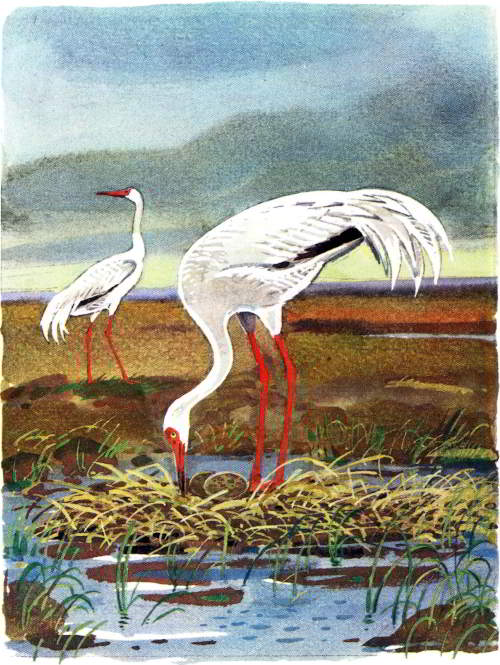 Рядом со стерхами в болотистой низине живут и другие птицы. Ближе к озеру устроили гнёзда несколько пар розовых чаек. На соседней кочке – гнездо крошечных куличков-плавунчиков. Повыше, у подножия бугра, поселилась пара диких белолобых гусей, рядом с ними – гнездо куликов-ржанок.
