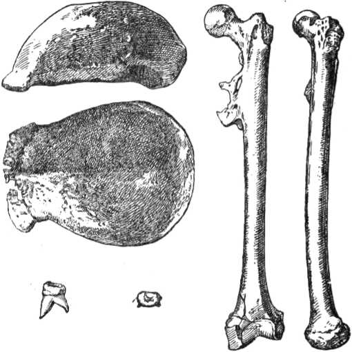 В 1856 году была сделана находка, привлекшая к себе внимание всего ученого мира. В местности Неандерталь, близ города Дюссельдорфа (Германия), были подобраны случайно найденные при земляных работах черепная крышка и некоторые другие части скелета, принадлежавшие человеку, который должен был резко отличаться от современного. Череп этого ископаемого человека (получившего название неандертальского человека) по некоторым признакам был похож на обезьяний. Но противники взгляда о существовании ископаемого человека заявляли, что одна черепная крышка не может служить доказательством. По их словам, обнаруженные в ней уклонения от нормального черепа следует объяснить тем, что она принадлежала не ископаемому человеку, а человеку современного типа, страдавшему какой-нибудь болезнью, вроде рахита или даже идиотизма. В довершение всего неандертальская черепная крышка была найдена одна, без всяких орудий, являющихся обычными спутниками доисторического человека.