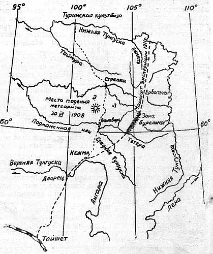 В 1911 году известный писатель В. Я. Шишков, работавший в то время начальником геодезической экспедиции, пробирался с Нижней Тунгуски на Ангару. Недалеко от реки Тэтэрэ караван натолкнулся на громадный район поваленного и вываленного леса. Расчеты А. В. Вознесенского, директора Иркутской обсерватории, проведенные на основе сейсмограмм и барограмм 30 июня 1908 года, позволили ему указать координаты центра катастрофы – 60°16′ с. ш. и 103°06′ в. д., что совпадает с этим районом.