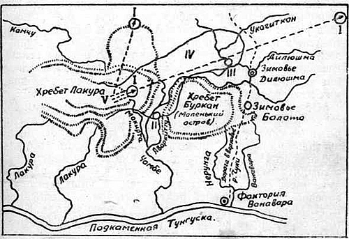 II, III – ближайшие к месту катастрофы эвенкийские стойбища;