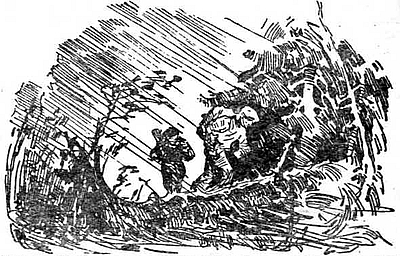 На следующий день, сварив для псов какое-то немыслимое грибное варево, Дима с Валерием надели рюкзаки и радиометры и, перейдя ручей, полезли на первую из подлежавших изучению сопок. Проводить индуктометрию на крутом склоне, покрытом к тому же поваленными деревьями, нелегко: рамка и кабель поминутно цепляются за всякие неровности, а в промежутках между камнями тональность звука заметно меняется, как над куском металла. Тем не менее мужественно преодолевая препятствия, взобрались на вершину и занялись забором проб.