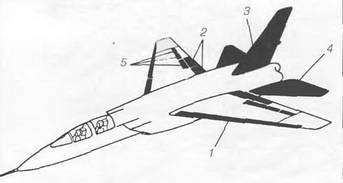 Элементы аэродинамической системы управления самолета: 1 – носовые щитки; 2 – закрылки; 3 – цельноповоротный киль; 4 – дифференциальный стабилизатор; 5 – интерцепторы