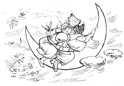 А тополя все падала вниз – назустріч твердій бруківці. Румцайс і Манка тільки й встигли подумати, що це – їхня остання хвилина. Та раптом молодий місяць на небі нахилився і подав Румцайсу кінчик свого ріжка. Румцайс скочив верхи на місяць, умостився там, як у сідлі, і перетяг до себе Манку.
