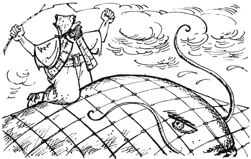 Манка натягла мотузку між двома вербами, потім ще раз, дала маленькому, наче трісочка, Волшовечеку другий кінець мотузки, і водяник почав снувати поміж тією основою, ніби ткацький човник. За кілька хвилин сітка була готова.