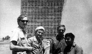 В прохладе фонтанов на центральной площади Ташкента (Б. Станков, автор, Н. Цыплаков и В. Ипатов).