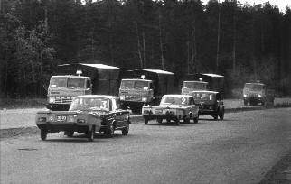 Надо сказать, что на всём протяжении пробега нас неизменно сопровождала патрульная машина ГАИ, идущая в голове колонны с включёнными мигалками и расчищавшая нам дорогу.
