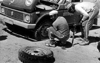 Особенно не везло в этом плане Ипатову, ехавшему впереди. Два раза пришлось останавливаться для замены колёс (почему-то только передних). В чём, естественно, помогали ему и мы с Николаем – он даже по-настоящему обжёг руку, неосторожно схватившись за баллонный ключ, лежавший в моторном отсеке и раскалившийся от жары и мотора.